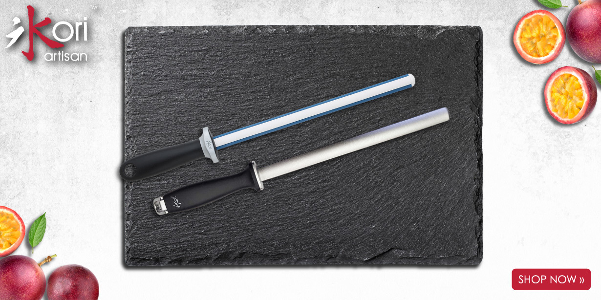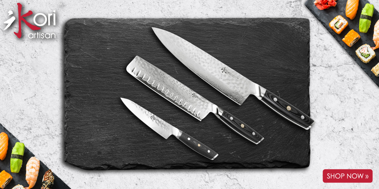 Taking over 60 steps to complete each knife, Canadian-designed Kori Artisan knives feature a cutting core of Japanese VG10 super steel surrounded by 36 layers of Damascus cladding, finished in a traditional hammered style. The durable and comfortable resin-impregnated canvas micarta handles are embellished with an intricate mosaic crest.