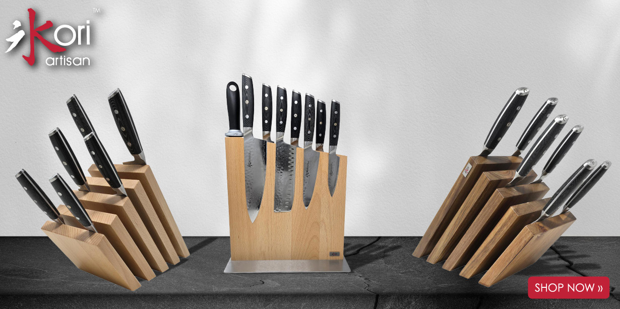 Taking over 60 steps to complete each knife, Canadian-designed Kori Artisan knives feature a cutting core of Japanese VG10 super steel surrounded by 36 layers of Damascus cladding, finished in a traditional hammered style. The durable and comfortable resin-impregnated canvas micarta handles are embellished with an intricate mosaic crest.